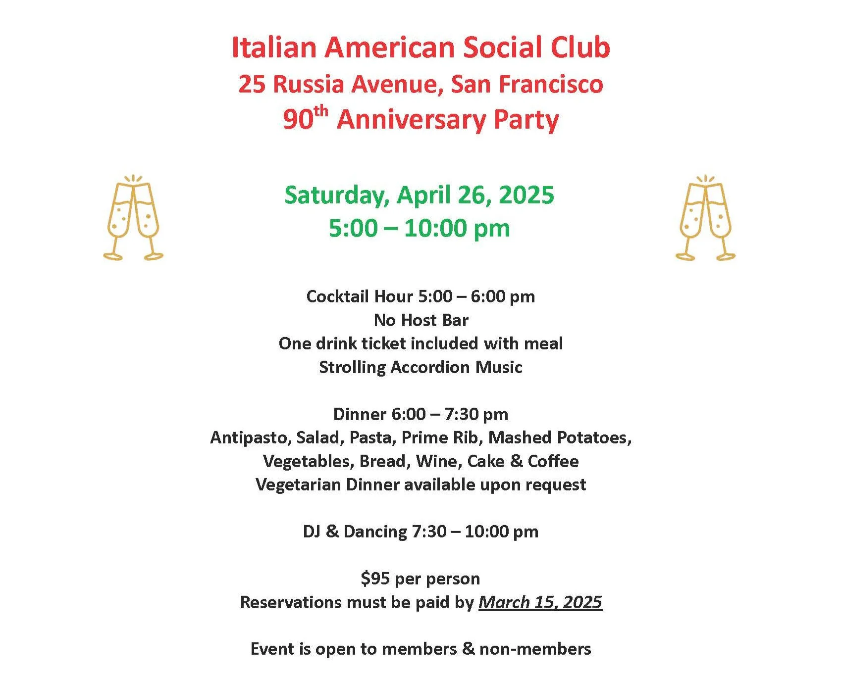 Antipasto, Salad, Pasta, Prime Rib, Mashed Potatoes, Vegetables, Bread, Wine, Cake & Coffee