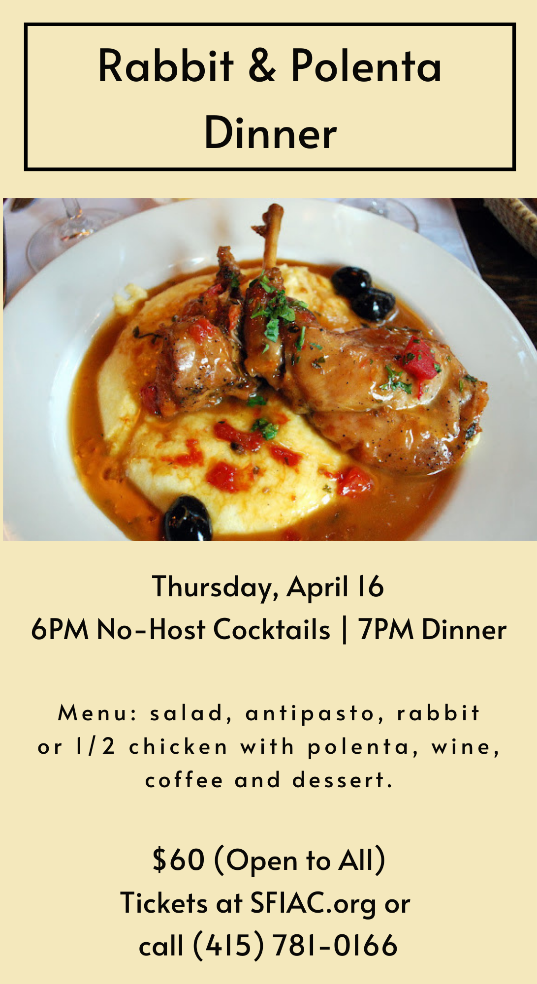 Join us at our annual Rabbit and Polenta mixer. No-Host Cocktails: 6:00PM Dinner: 7:00PM